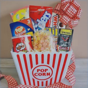A movie night snack basket pretty much covers everything he actually wants on a Friday night. Popcorn, candy, maybe some chips — it's a low-key gift that'll genuinely get used.